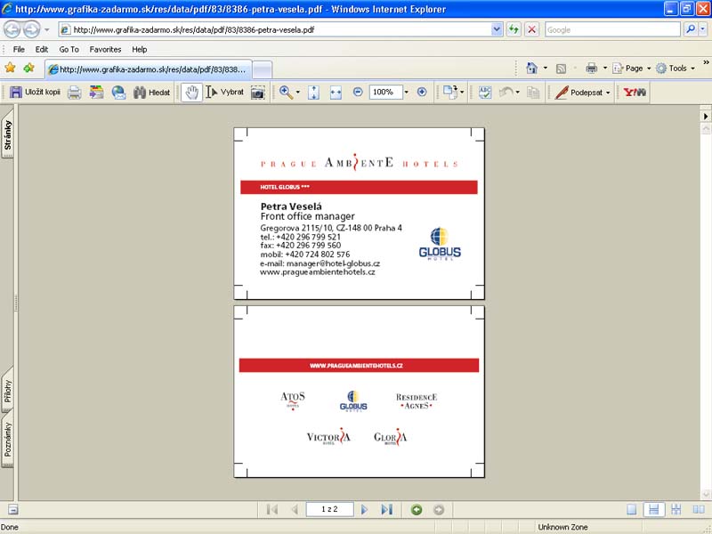 Hotelový reťazec www.pragueambientehotels.cz má 5 hotelov, každý s iným logom. Vytvorili sme pre nich 8 vzorov vizitiek. Zo vzorov si konkrétne vizitky vytvárajú a objednávajú sami.